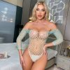A daring and alluring one-piece outfit featuring a gradient green European/American-inspired design. The fishing net construction, combined with a figure-hugging bag hip skirt and long sleeves, creates a provocative and unique look. Its key benefit is a bold and confident statement, offering a blend of sensuality and edgy style. The all-in-one design ensures effortless wear and a striking silhouette.