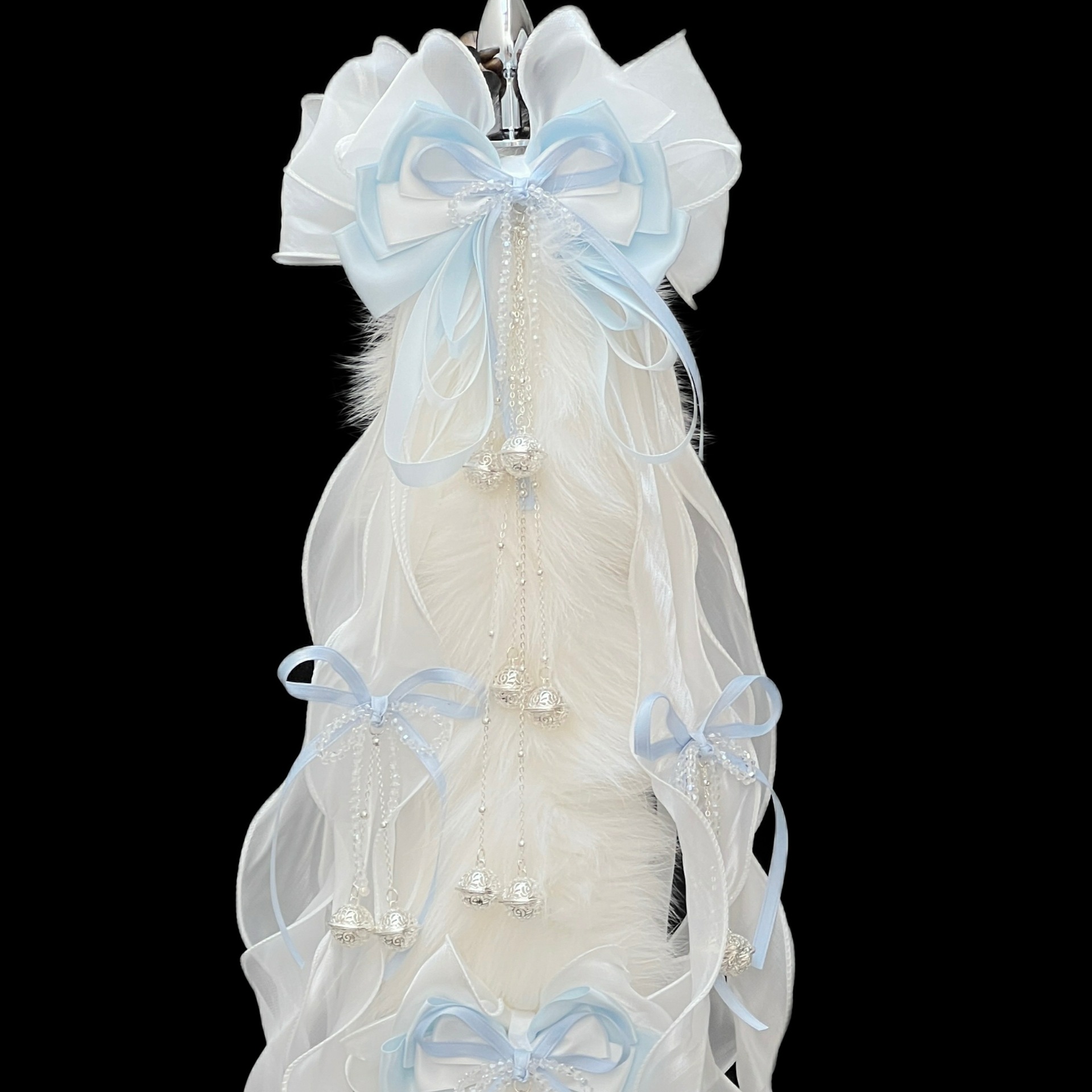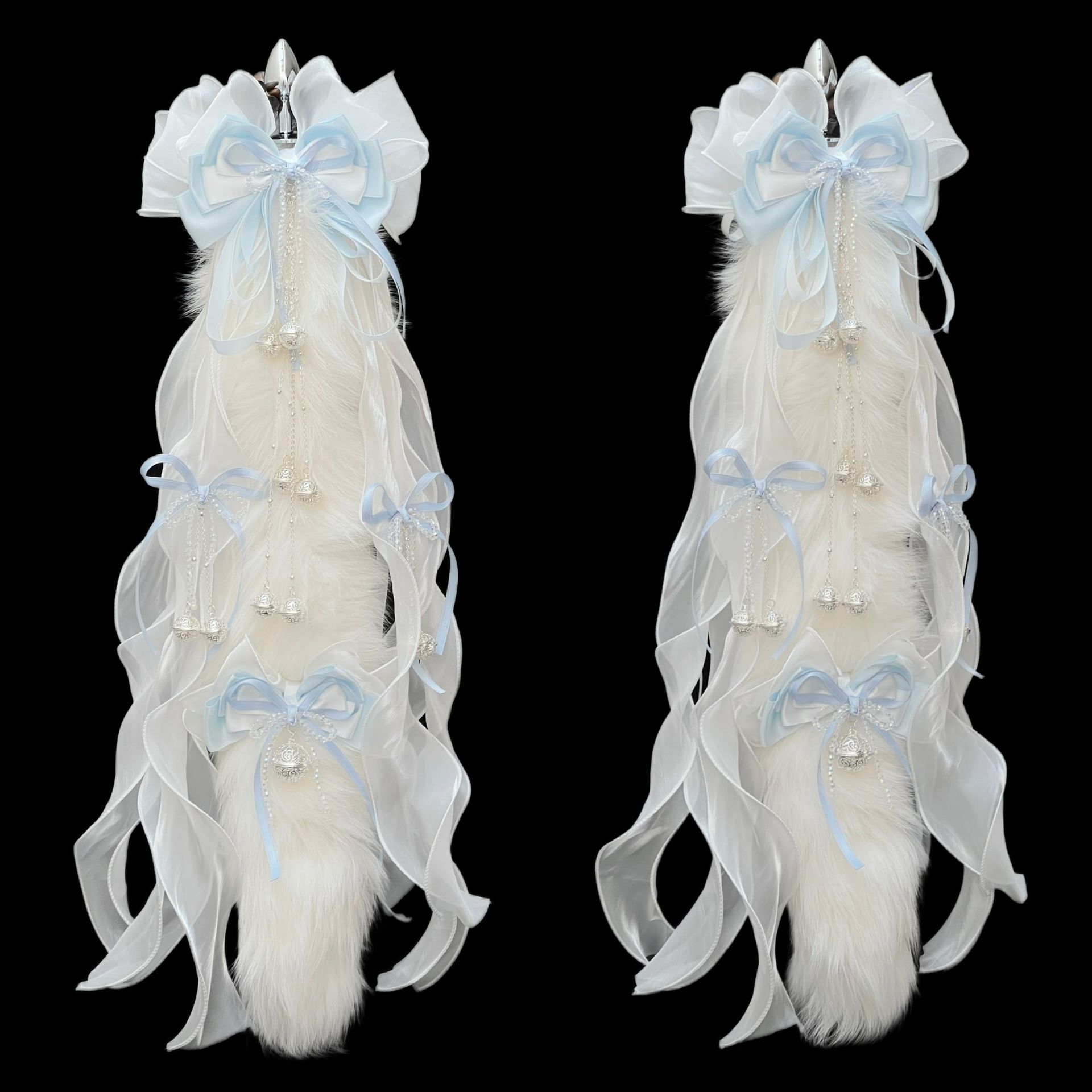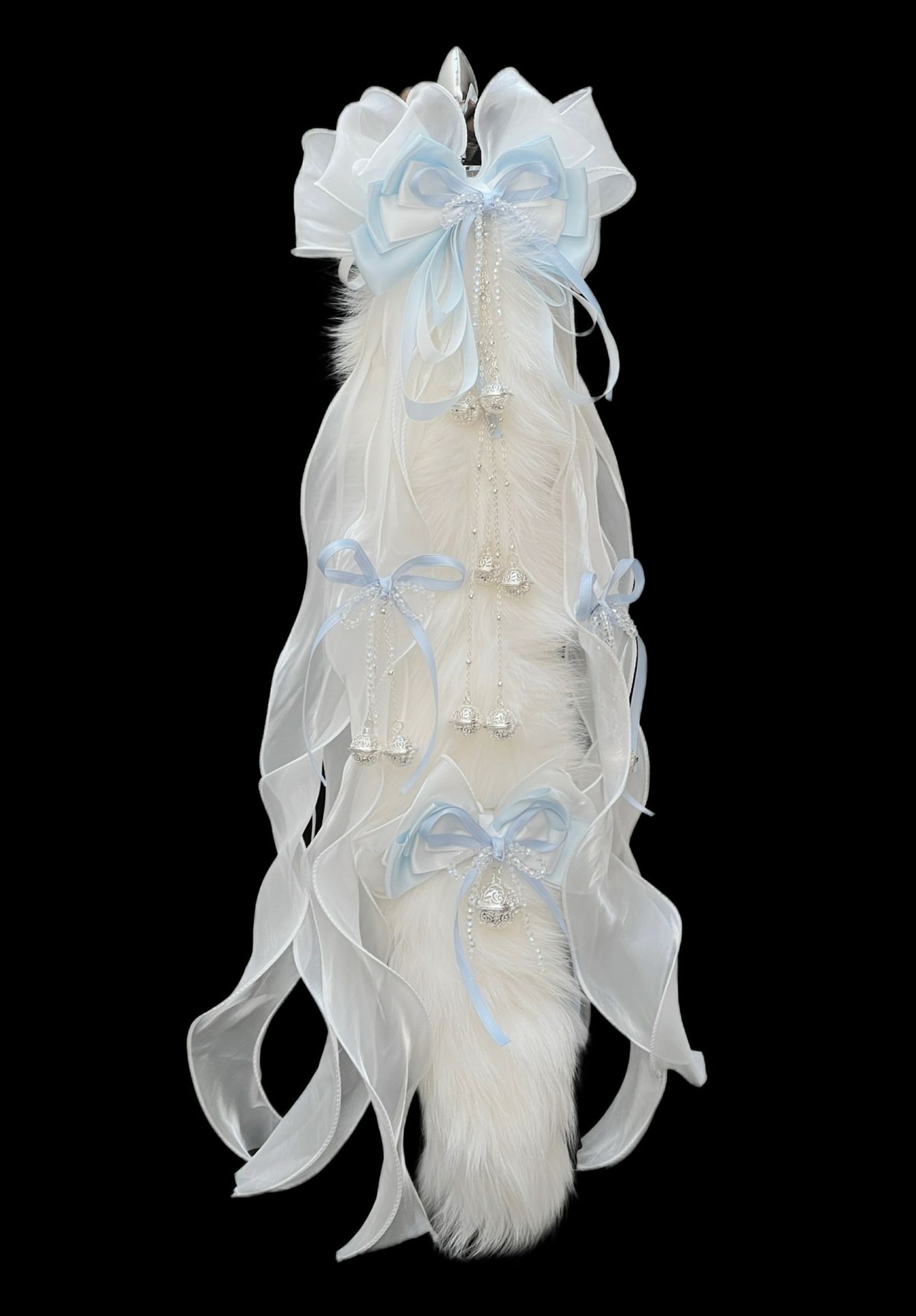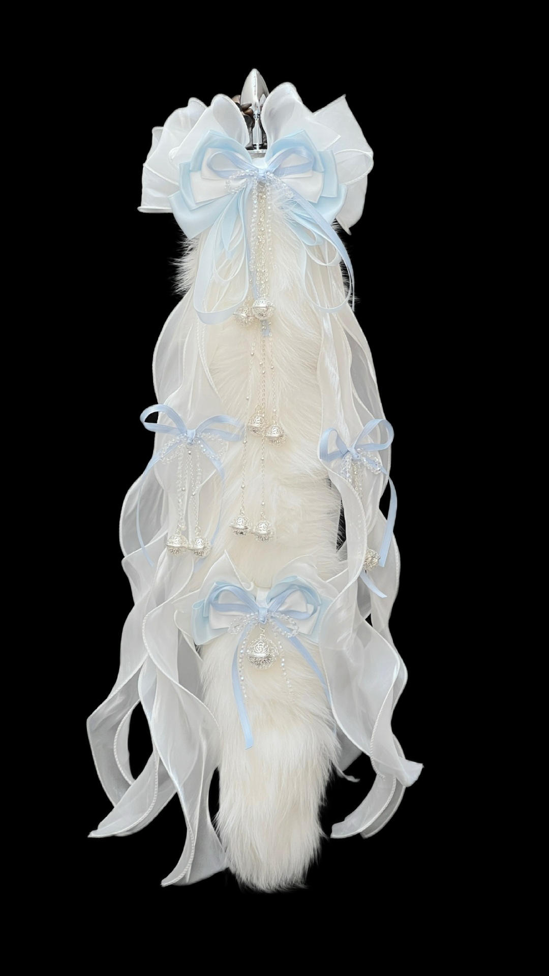 60cm white fox real fur tail, 50cm big bow streamer, strap detachable design. The middle small bowknot of the tail is fixed and cannot be disassembled.