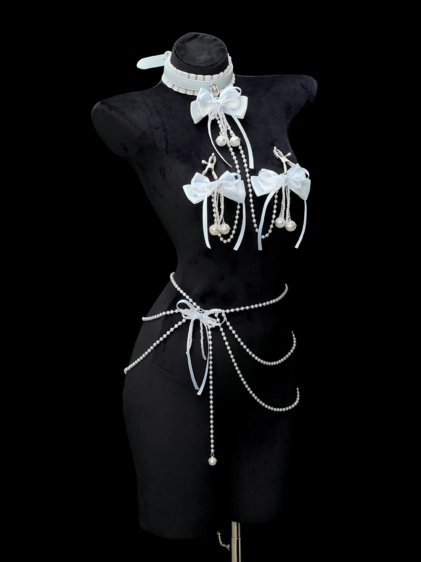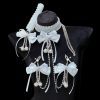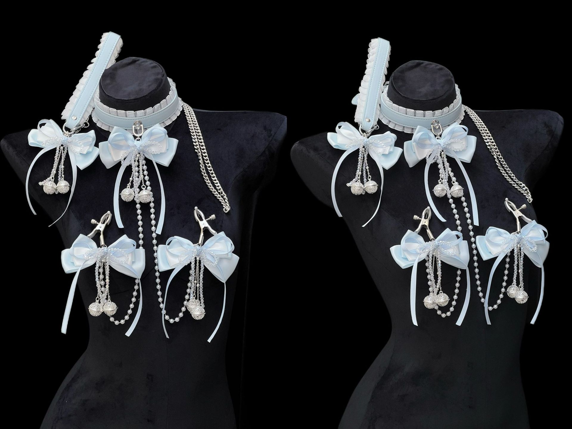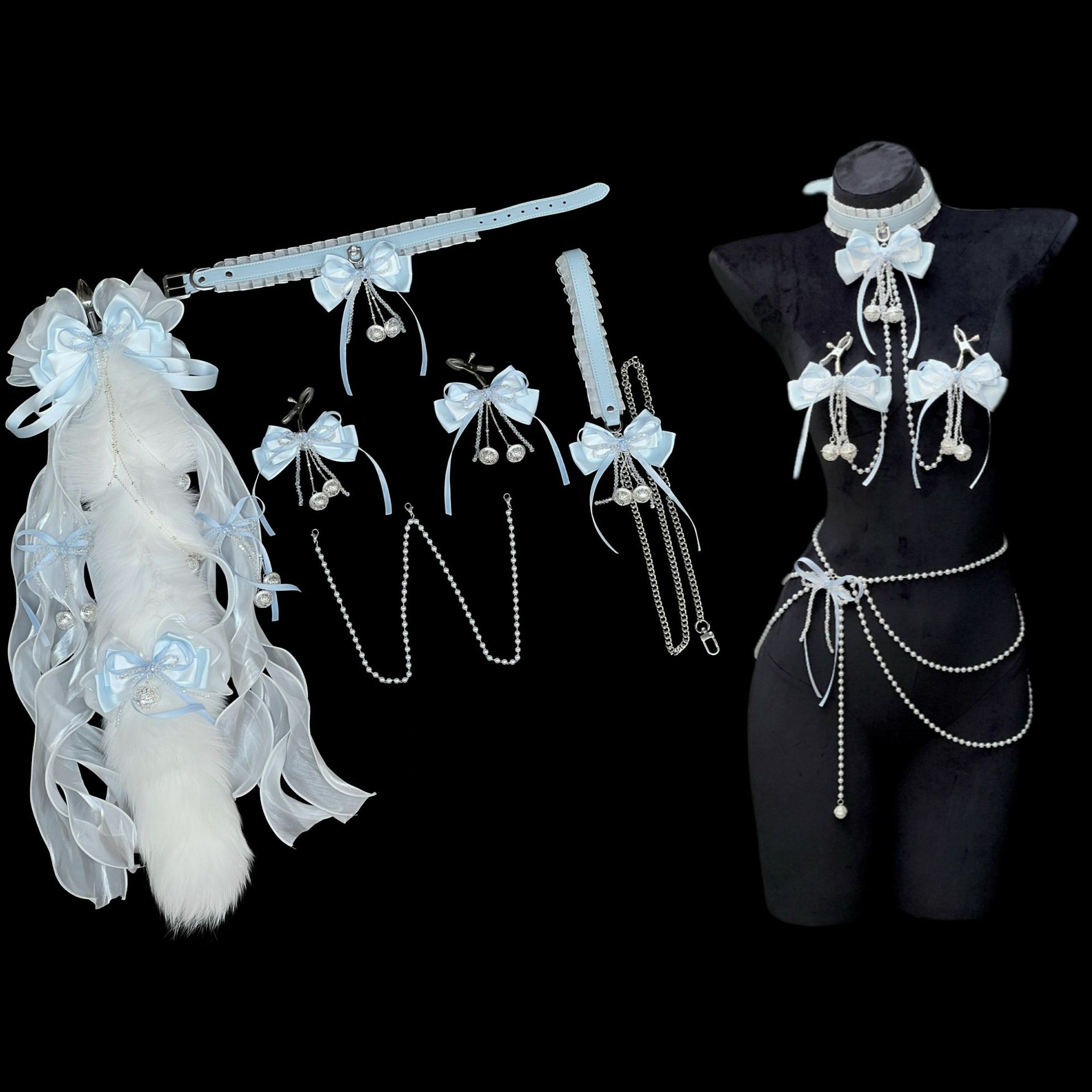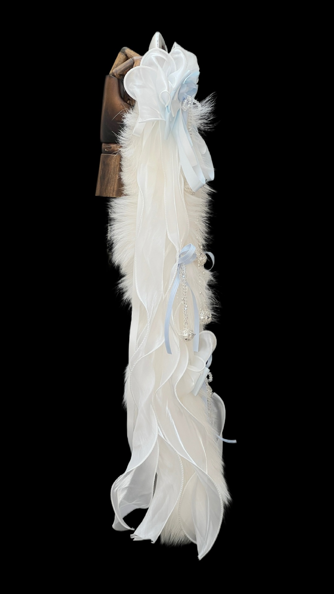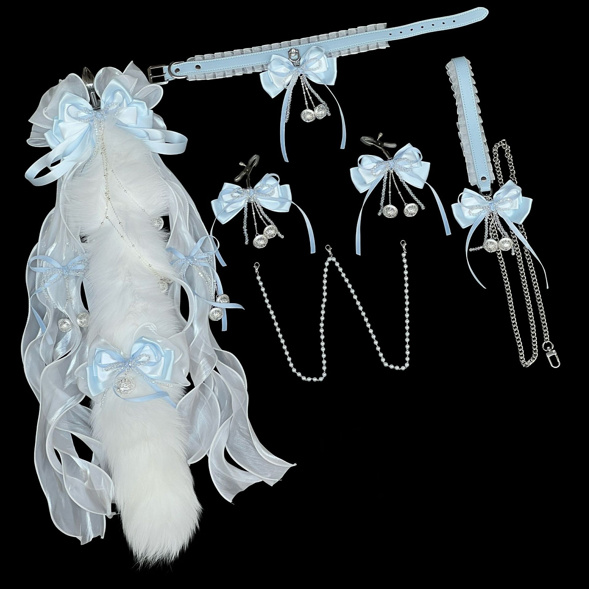 60cm white fox real fur tail, 50cm big bow streamer, strap detachable design. The middle small bowknot of the tail is fixed and cannot be disassembled.