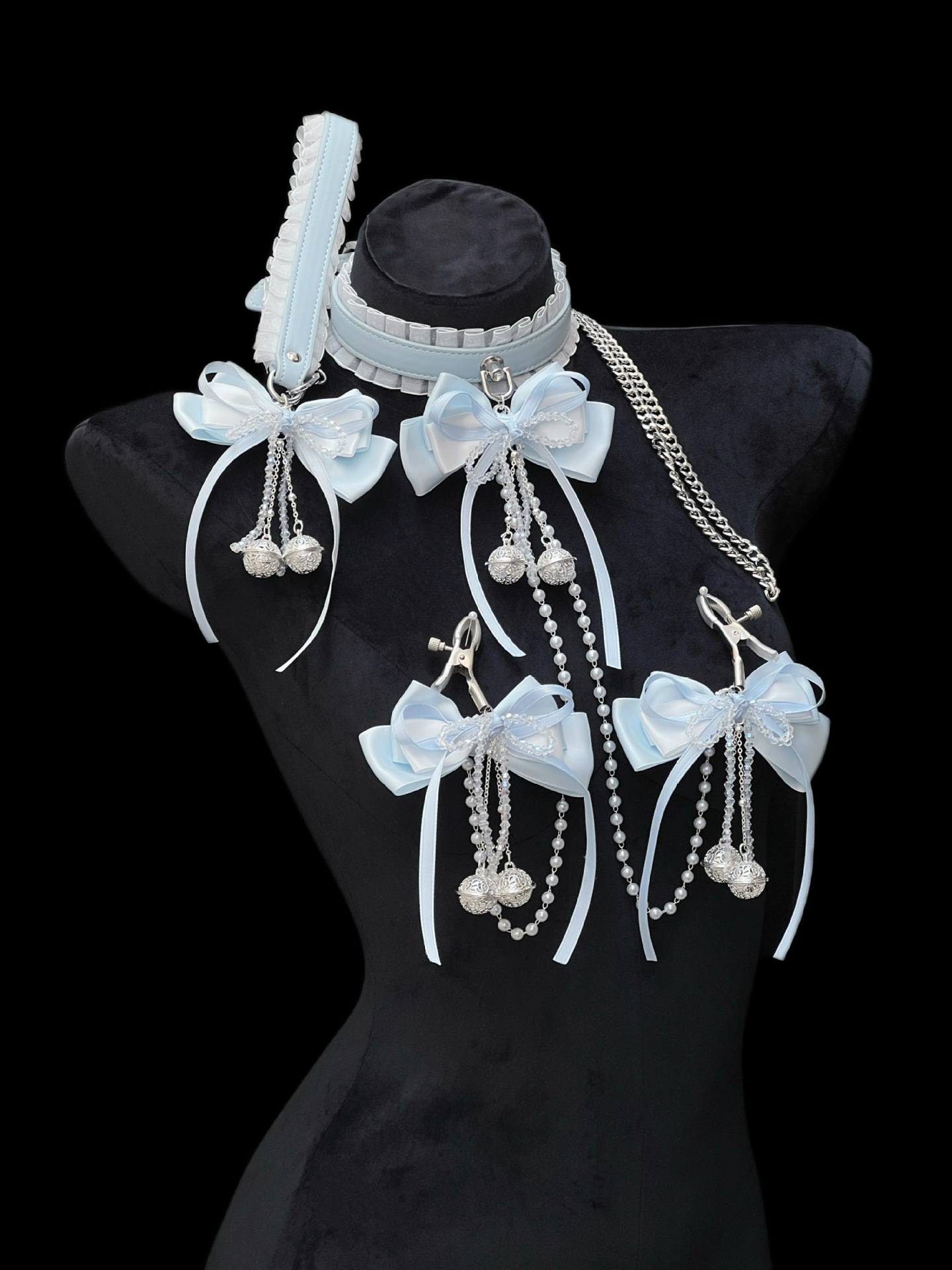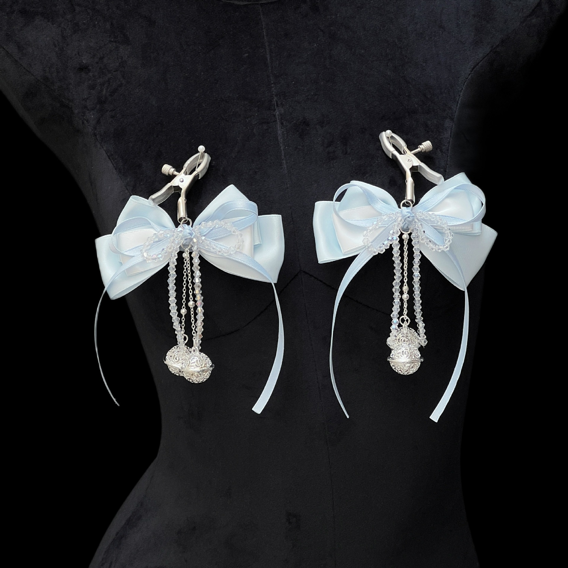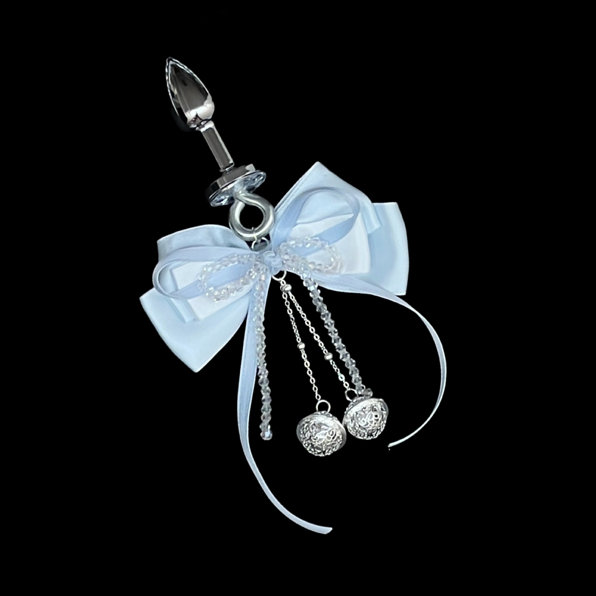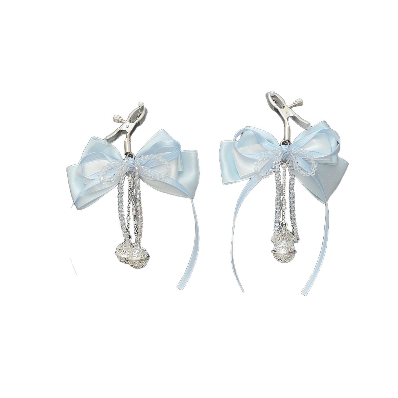 Original handmade cute blue and white bow 2. 1cm Bell, glass bow beaded, 100CM metal hand holding rope.