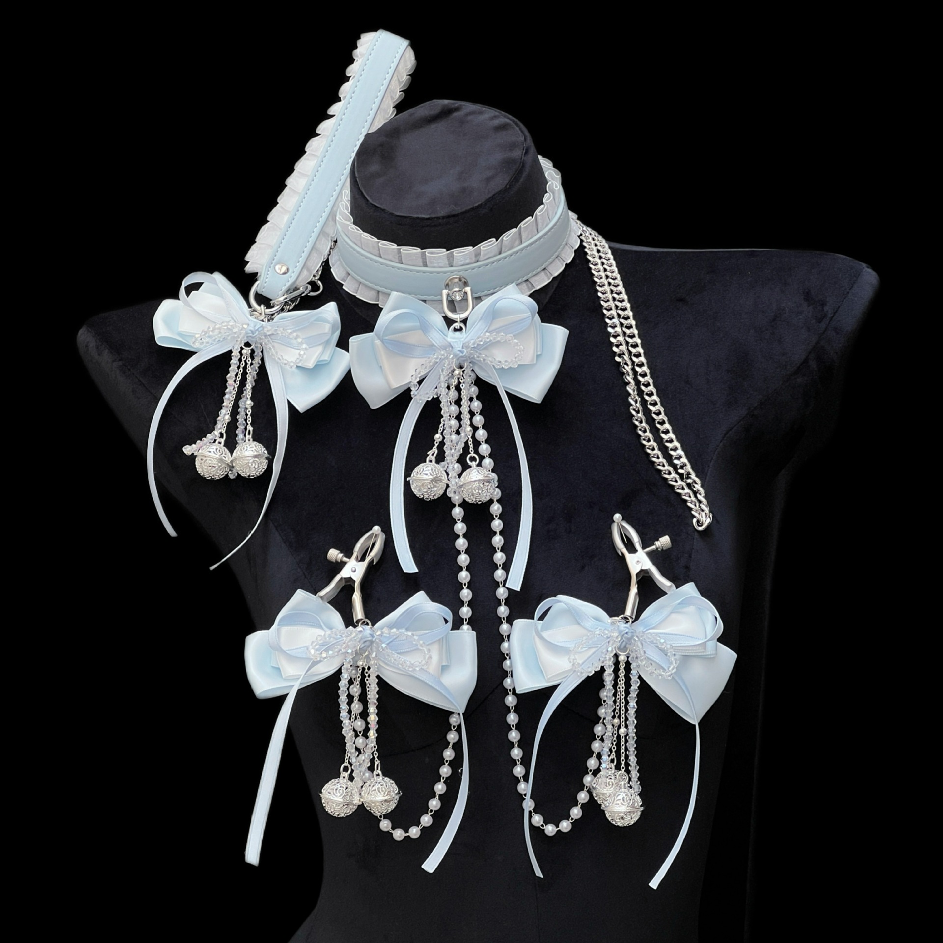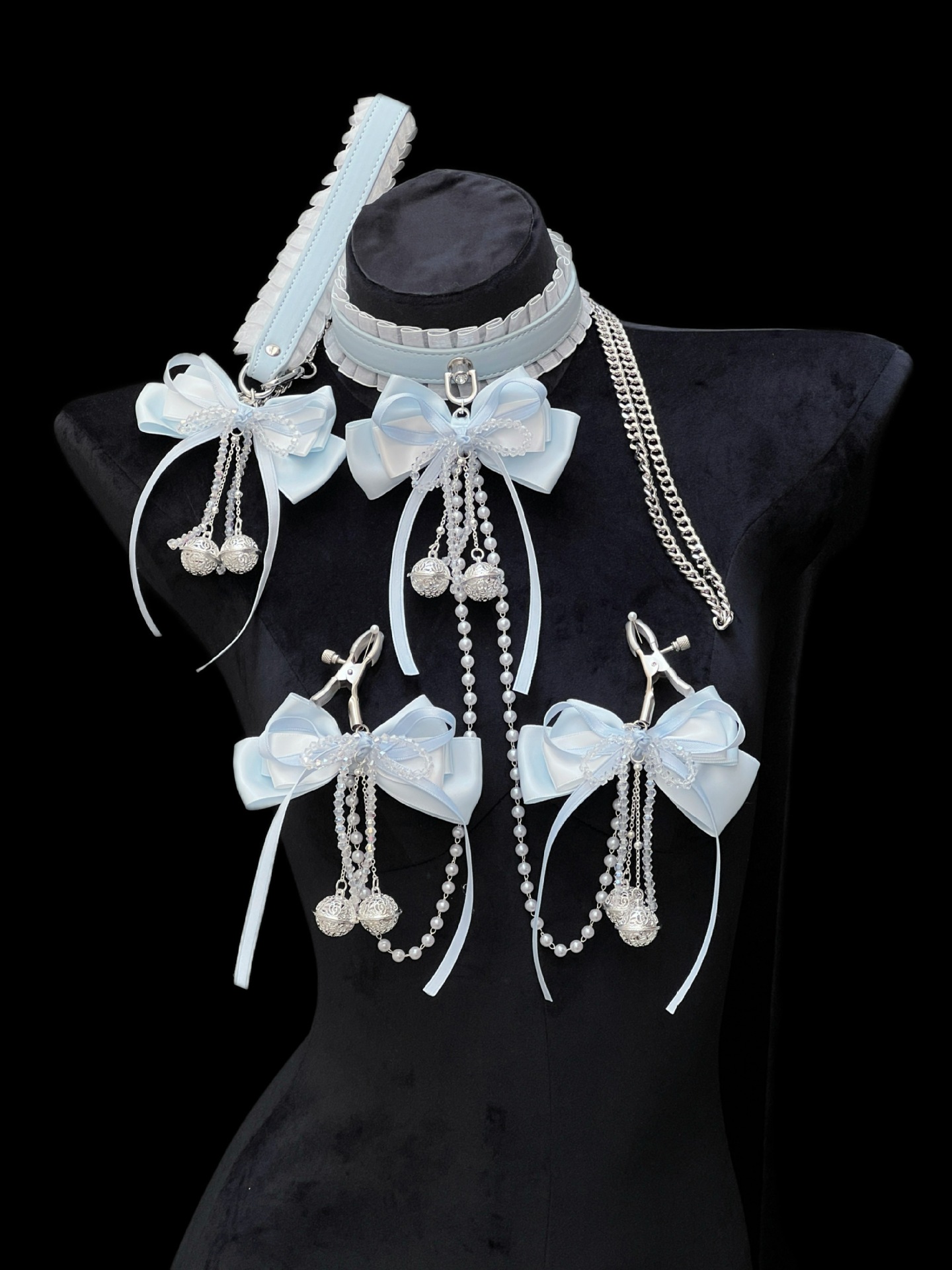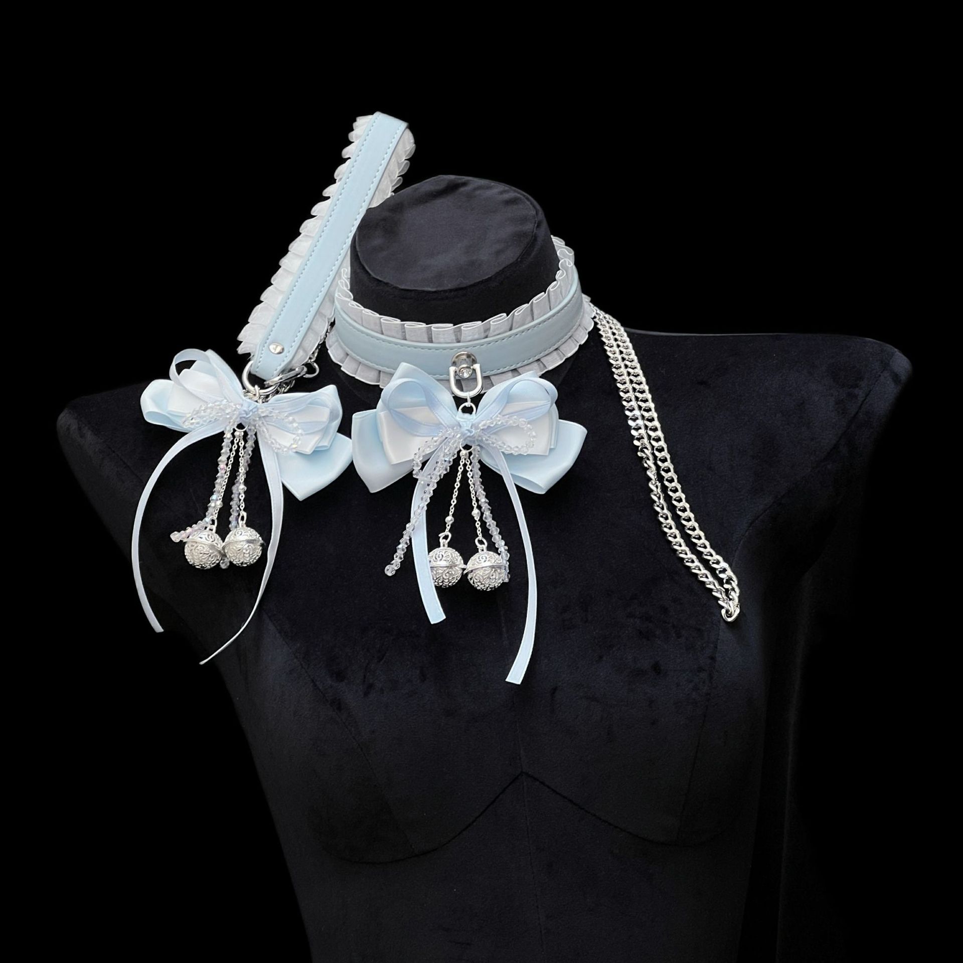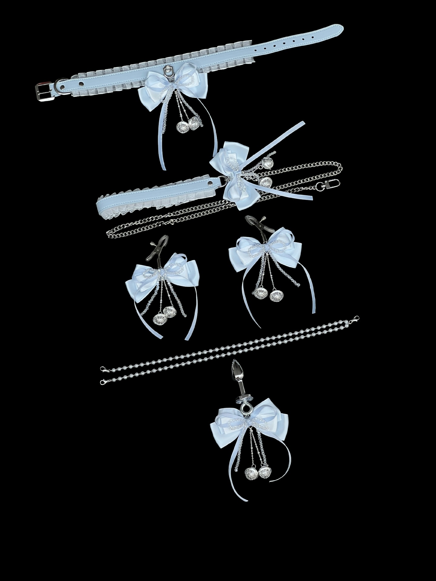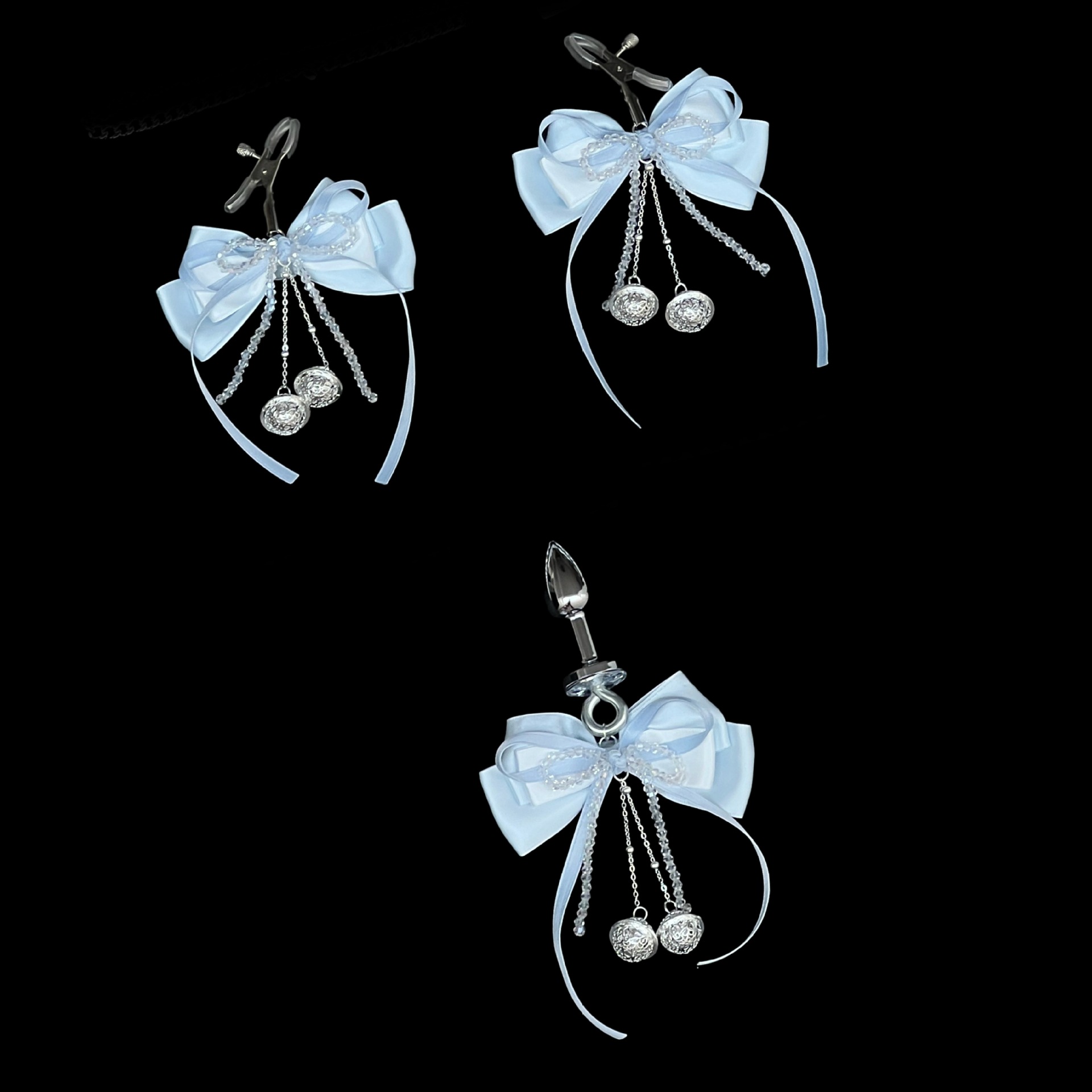 Original handmade cute blue and white bow 2. 1cm Bell, glass bow beaded, 100CM metal hand holding rope.