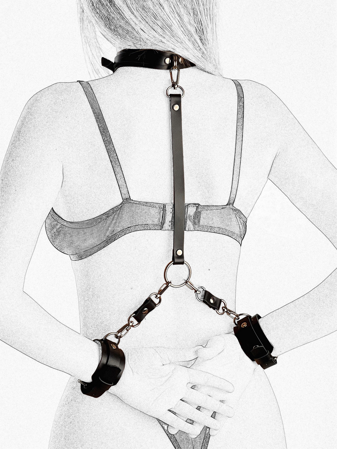 This meticulously crafted set includes adjustable wrist restraints, a comfortable neck collar, a connecting chain, and a secure strap with a hook closure. Each component is designed with both comfort and security in mind, allowing for a customizable experience tailored to your individual preferences.