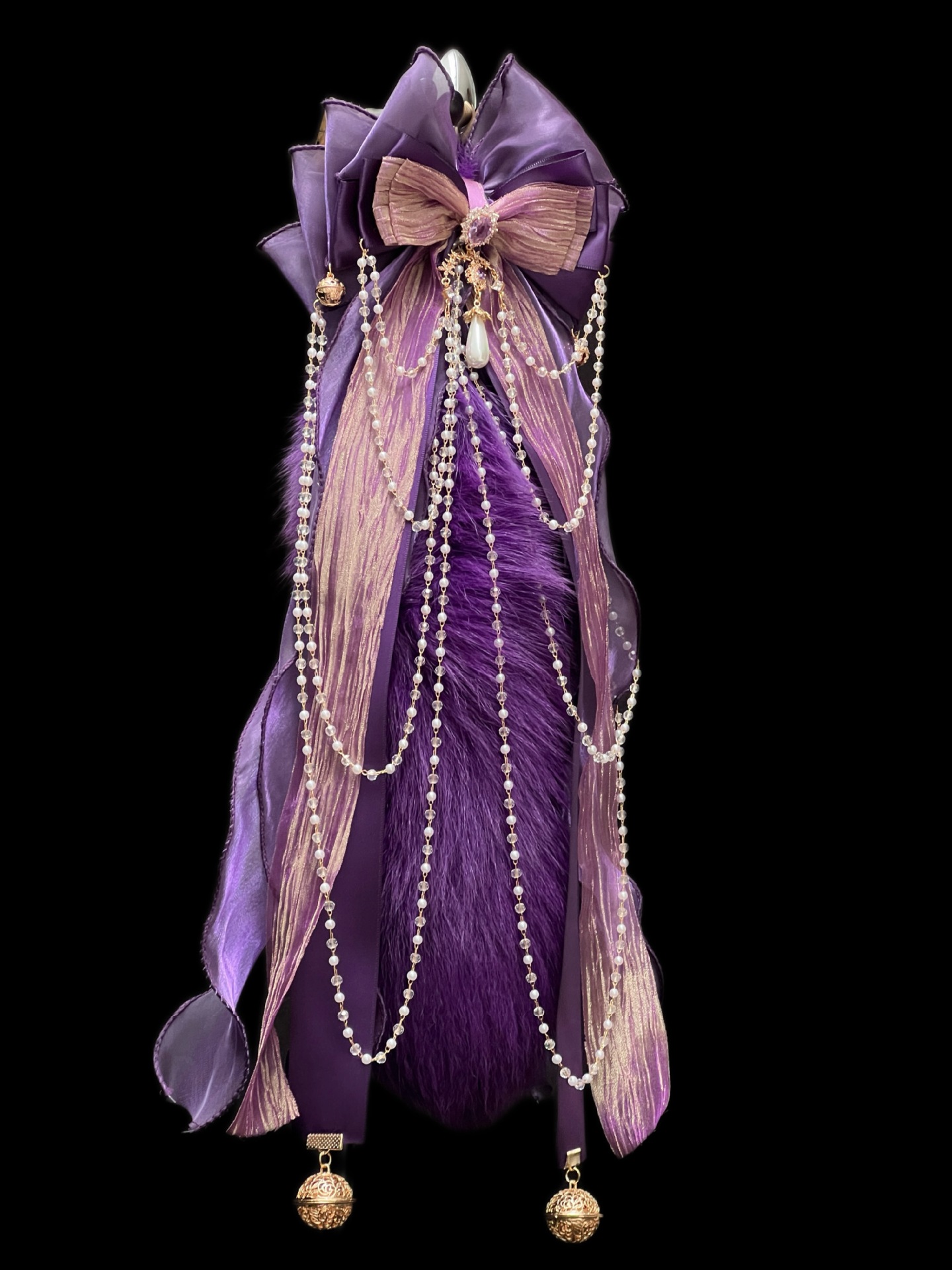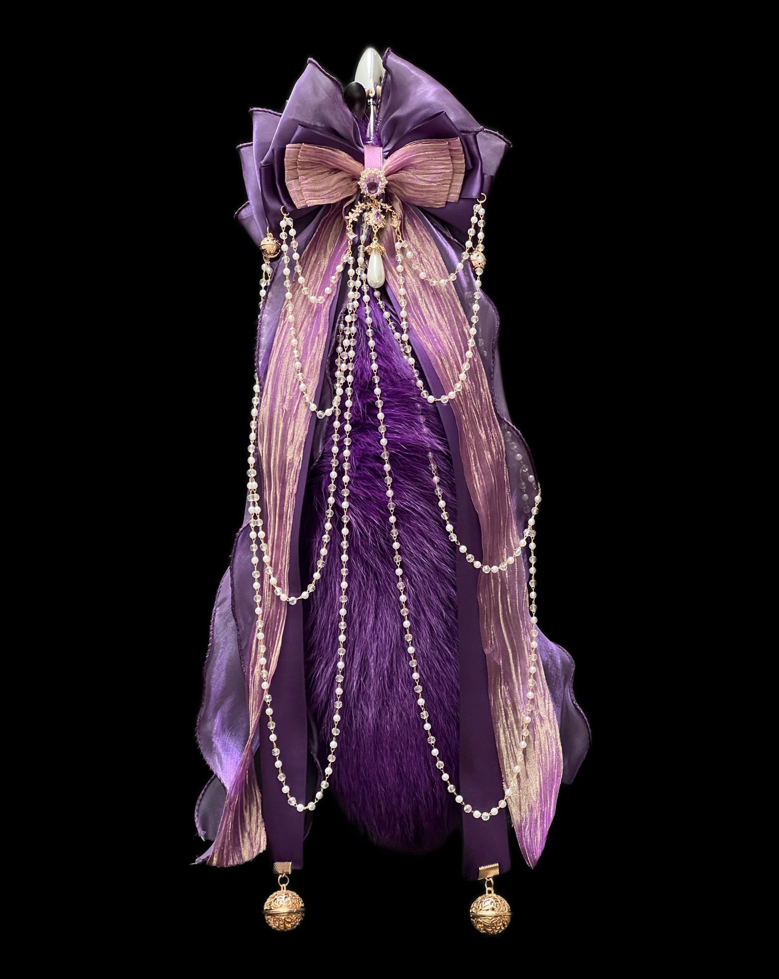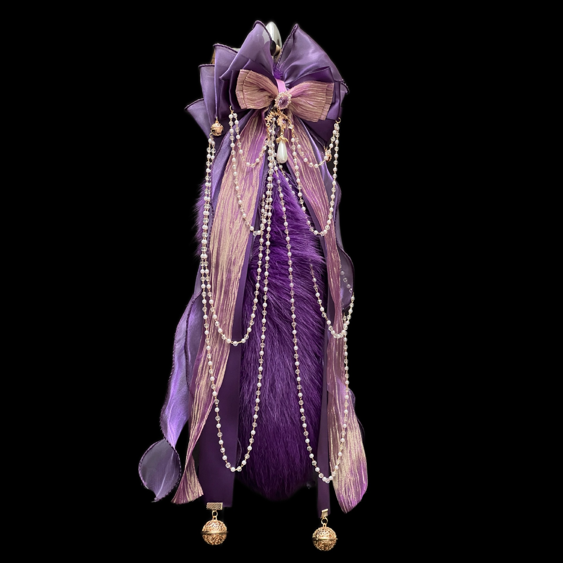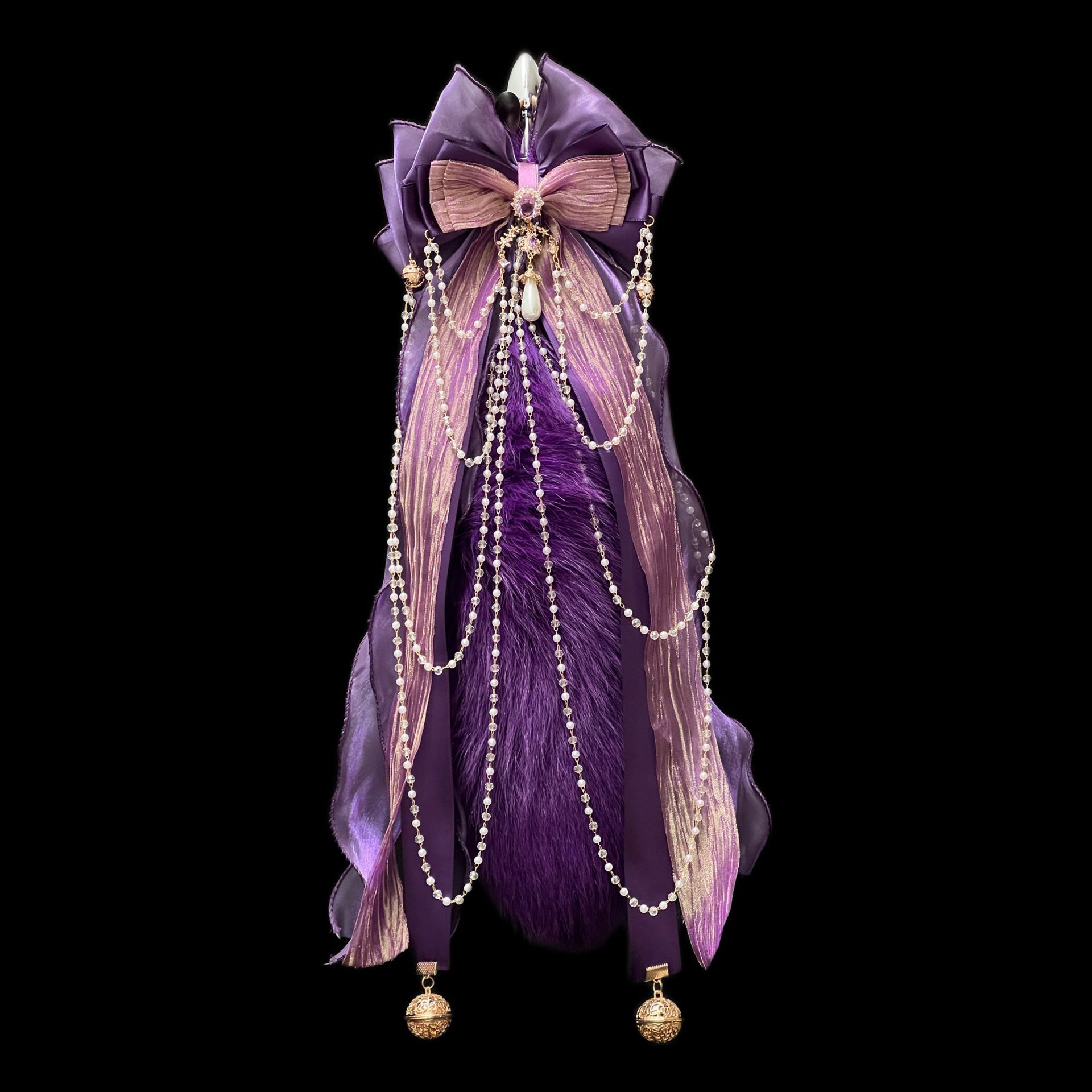 40CM深紫色狐狸真毛尾巴,原创手作重工蝴蝶结,1.2CM铜铃,2.6CM宫铃,仿珍珠玻璃链条。