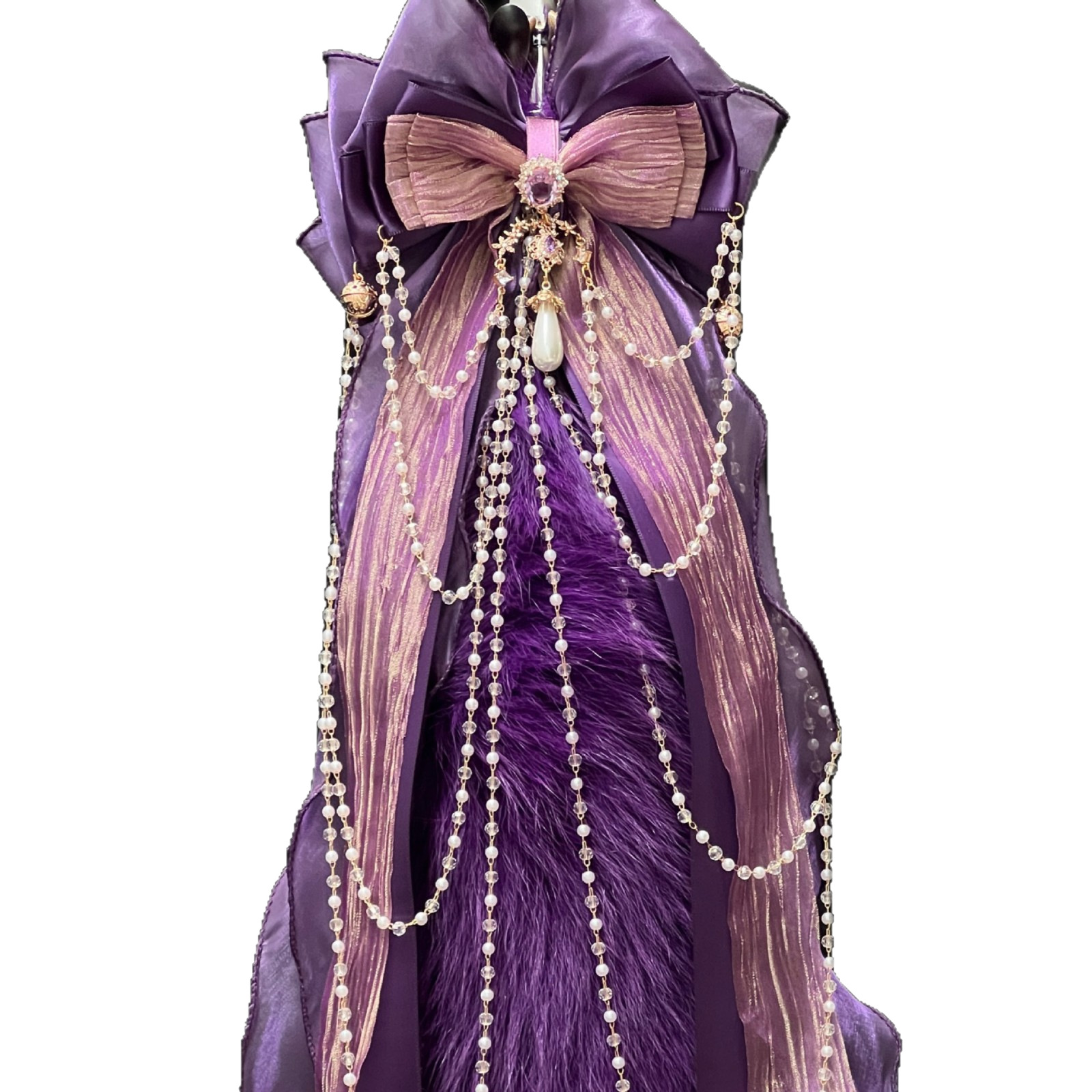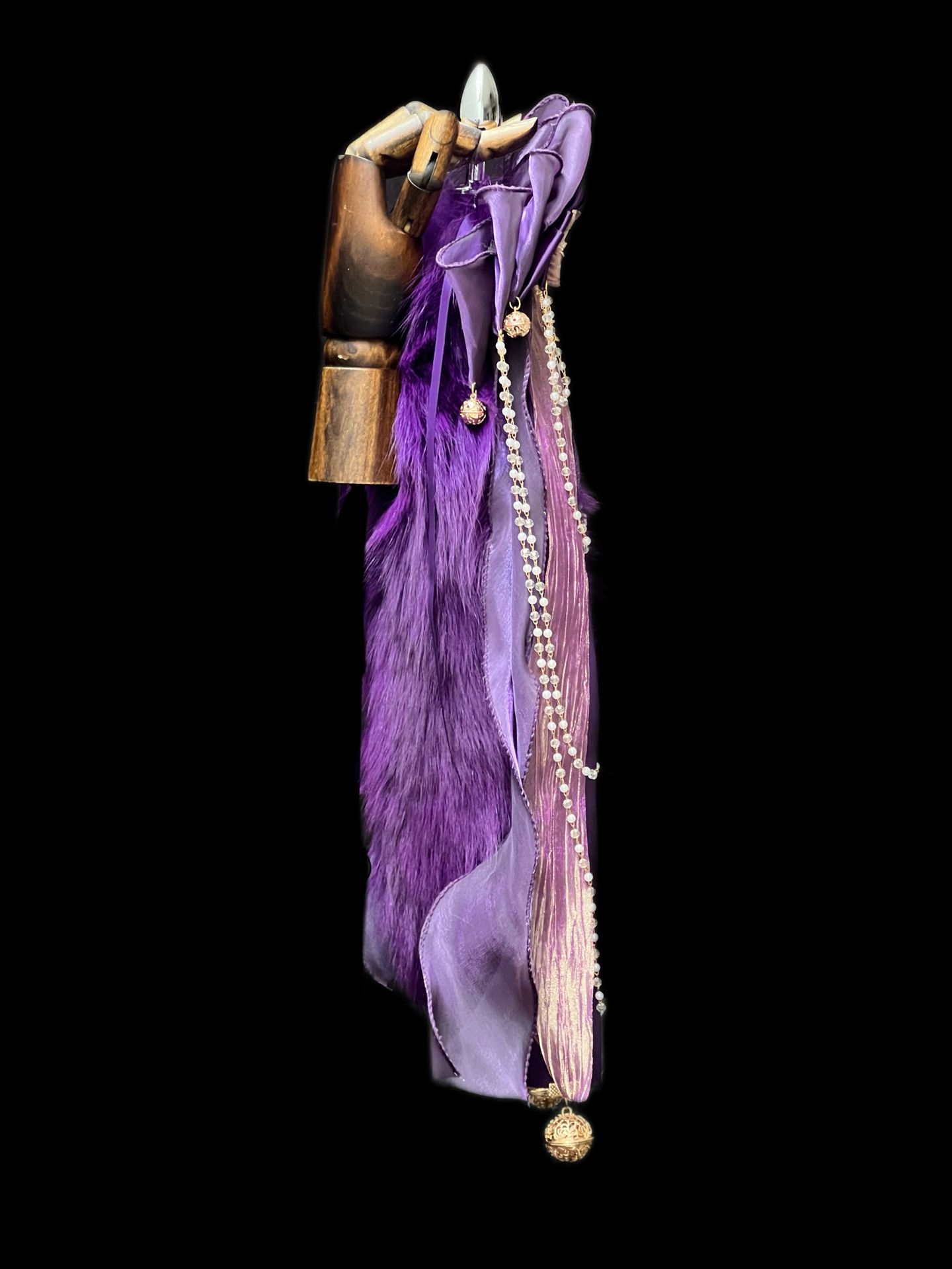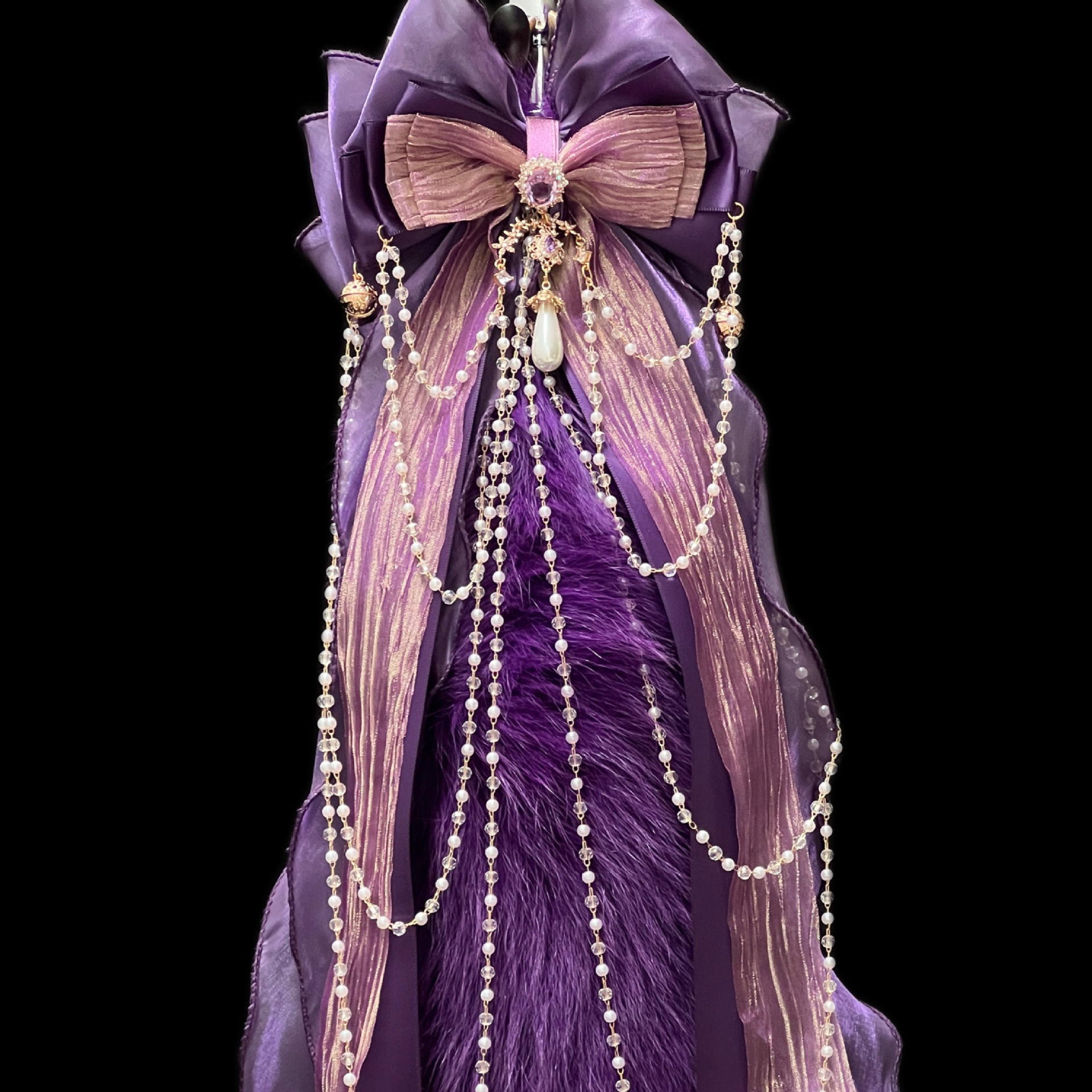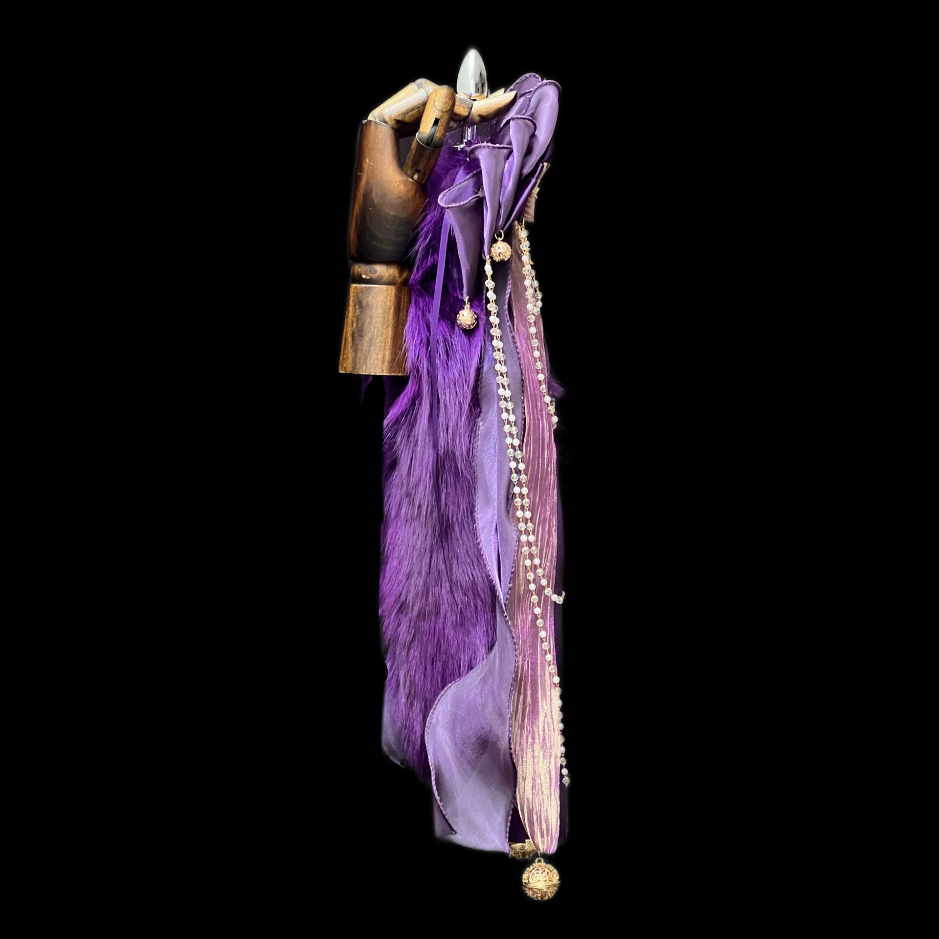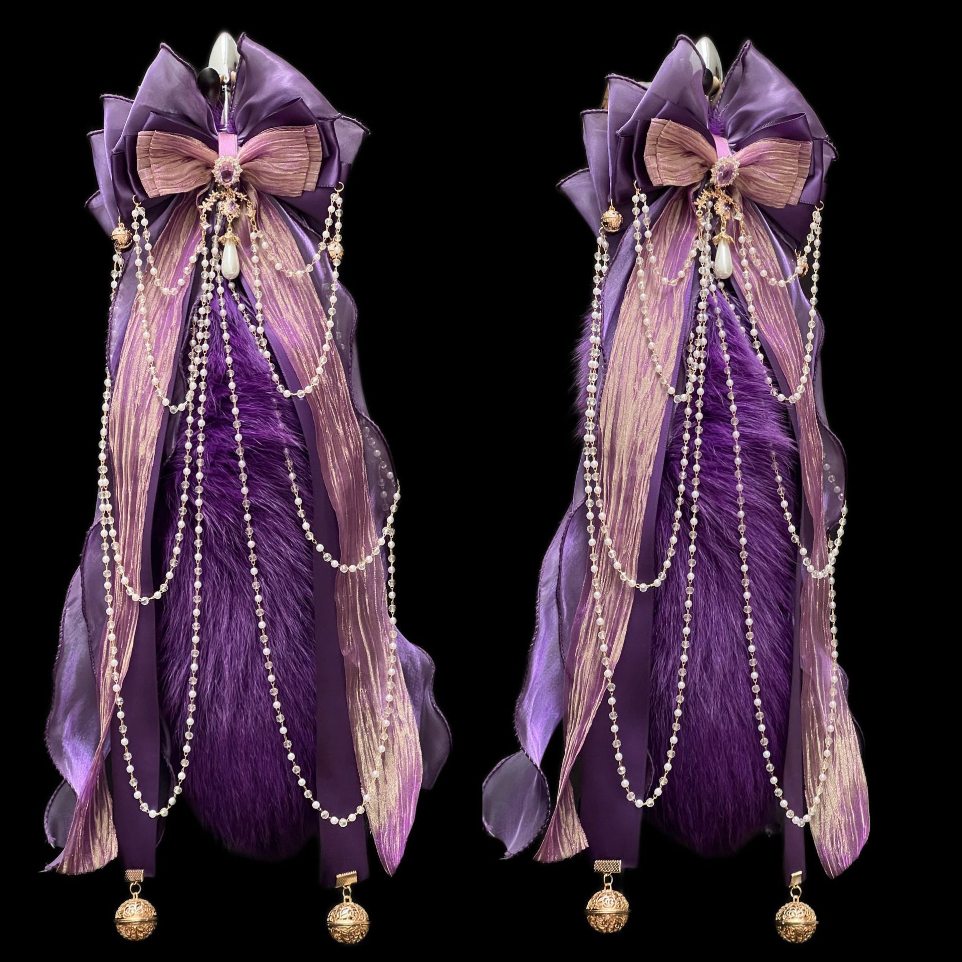 40CM深紫色狐狸真毛尾巴,原创手作重工蝴蝶结,1.2CM铜铃,2.6CM宫铃,仿珍珠玻璃链条。